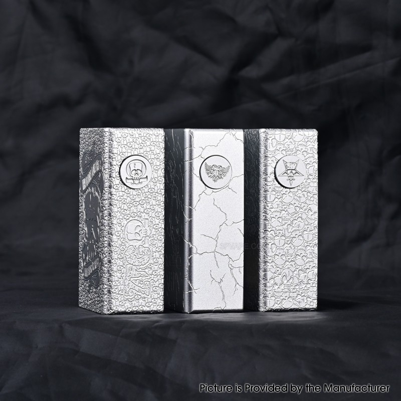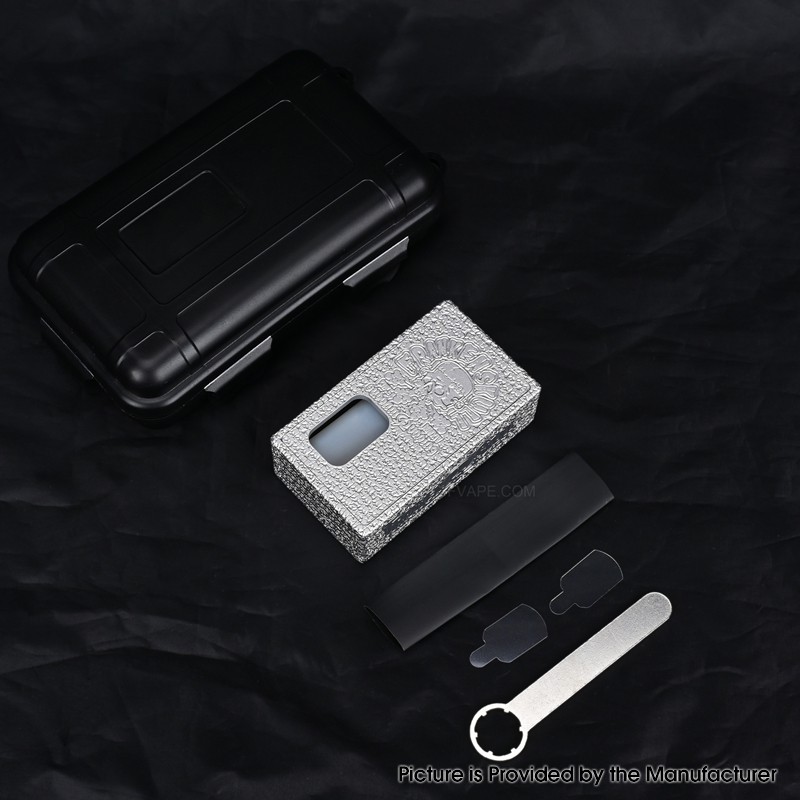 The Frankenskull Style Squonk BF Bottom Feeder Mechanical Box Mod is made from aluminum alloy and Power by 1 x 18650 battery (Not included). The Positive electrode insulation circuit protection (safe and reliable) and battery supports both positive and negative installation. The internal silver parts of the 18650 ignition plate are all silver-plated brass.