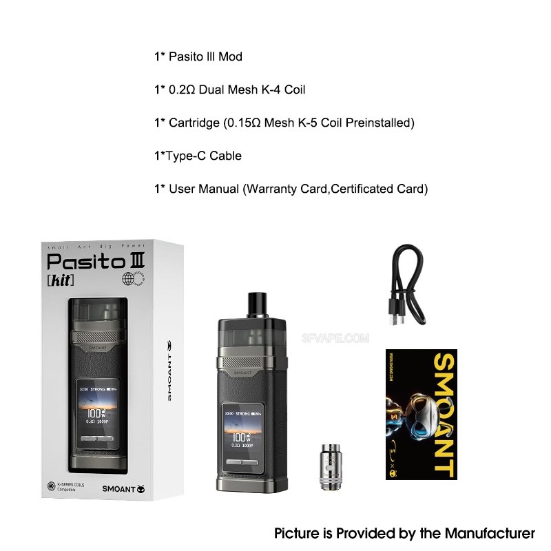 | Package | 1 x Pasito III Device, 1 x Pasito III Pod Cartridge (7ml), 1 x K-Series Coil (0.15ohm Mesh K-5 coil pre-installed), 1 x K-Series Coil (0.2ohm Dual Mesh, in-box), 1 x Type-C USB Cable, 1 x User Manual & Warranty Card |