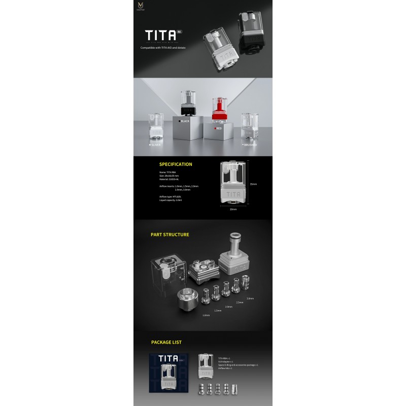 | Package | 1 x Tank TITA RBA (3ml), 1 x 510 adapter, 1 x Replacement O-Ring, 5 x Air Pin (1.0, 1.5, 2.0, 2.5, 3.0mm), 1 x User Manual |