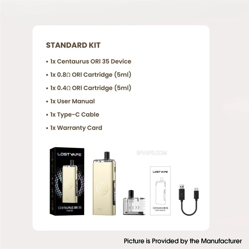 | Package | 1 x Lost Vape Centaurus Ori 35 Device, 1 x Centaurus Ori Pod Cartridge 5ml 0.4ohm, 1 x Centaurus Ori Pod Cartridge 5ml 0.8ohm, 1 x Type-C Cable, 1 x User Manual |
