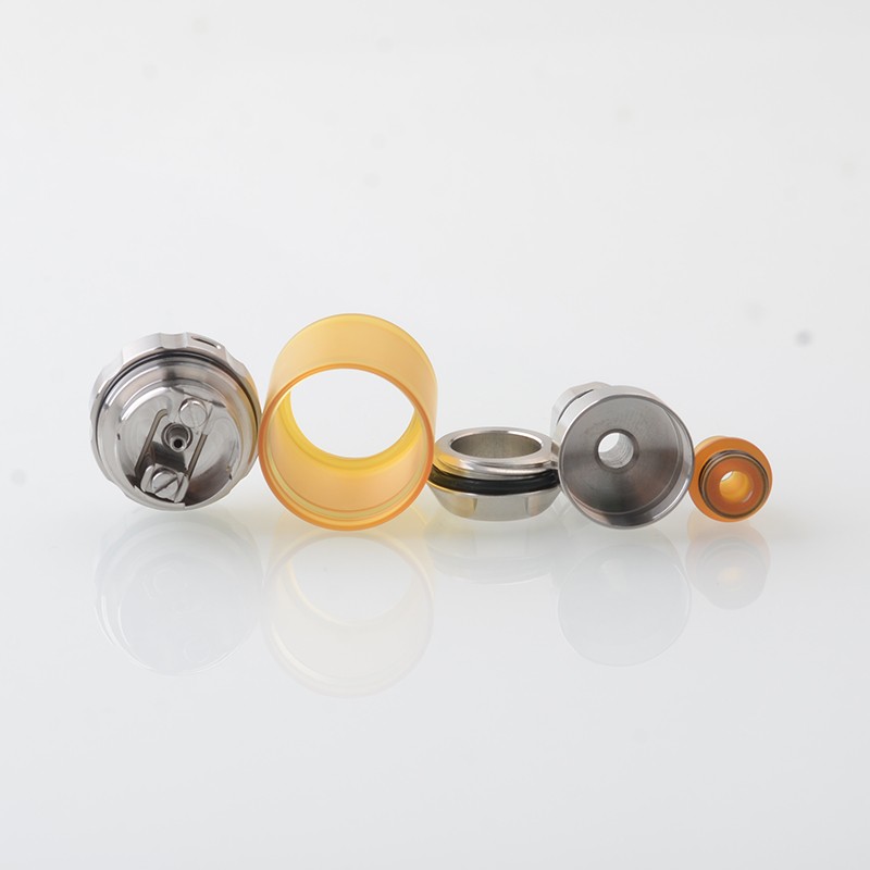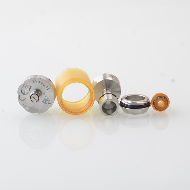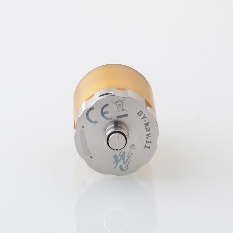 The BY-KA V.11 V11 Style MTL RTA Atomizer is made from stainless steel with 23mm diameter and PEI tank tube with 3.1ml capacity. The RTA comes with 3 PCS Air pins: 1.2mm / 1.4mm / 1.7mm (one pre-installed) for MTL Vaping.