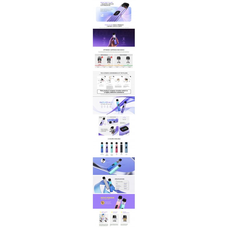 | Package | 1 x Novo Go Device (1350mAh), 1 x Novo Pod Cartridge (SLR) Meshed 0.6 ohm 2ml (Pre-installed), 1 x User Manual |