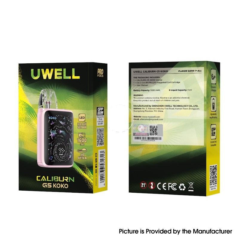 The authentic Uwell Caliburn G5 KOKO Pod System Kit combines a compact, stylish design with powerful performance and flexible airflow for both MTL and RDL vaping styles. Featuring a built-in 1600mAh battery and max 35W output, the G5 KOKO delivers long-lasting power and consistent vapor production in a pocket-friendly form.