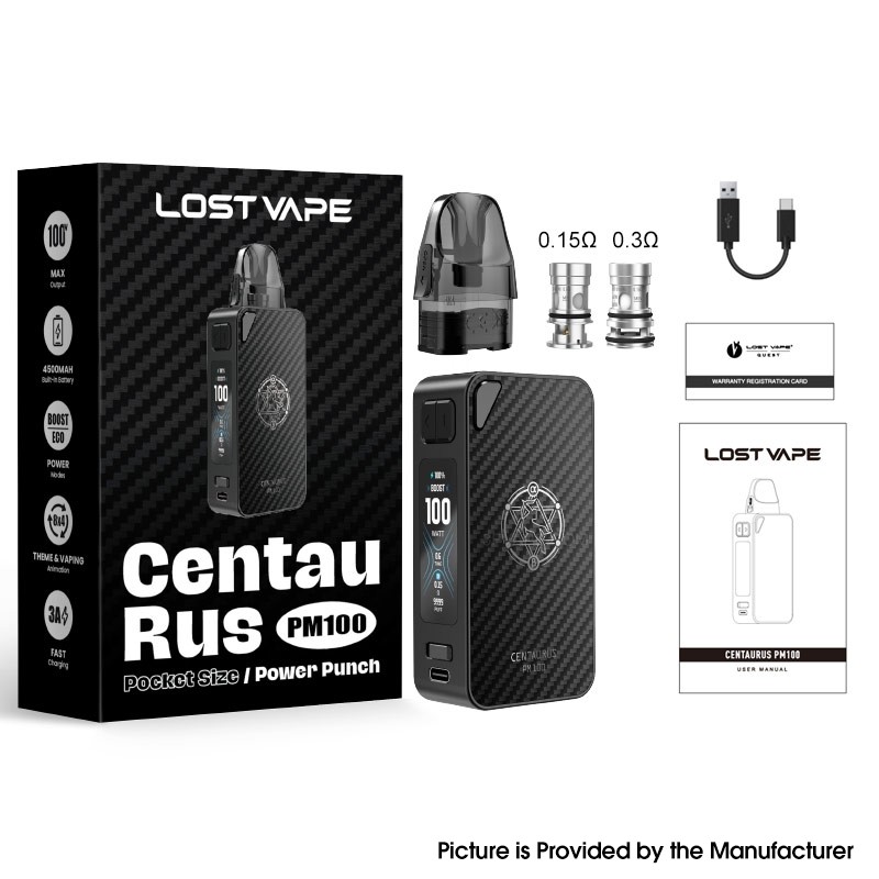 | Package | 1 x Centaurus PM100 Pod Mod, 1 x Ultra S Pod Cartridge (5ml), 1 x UB Ultra V4 Coil 0.15ohm, 1 x UB Ultra V4 Coil 0.3ohm, 1 x Type-C Cable, 1 x User Manual, 1 x Warranty Card |