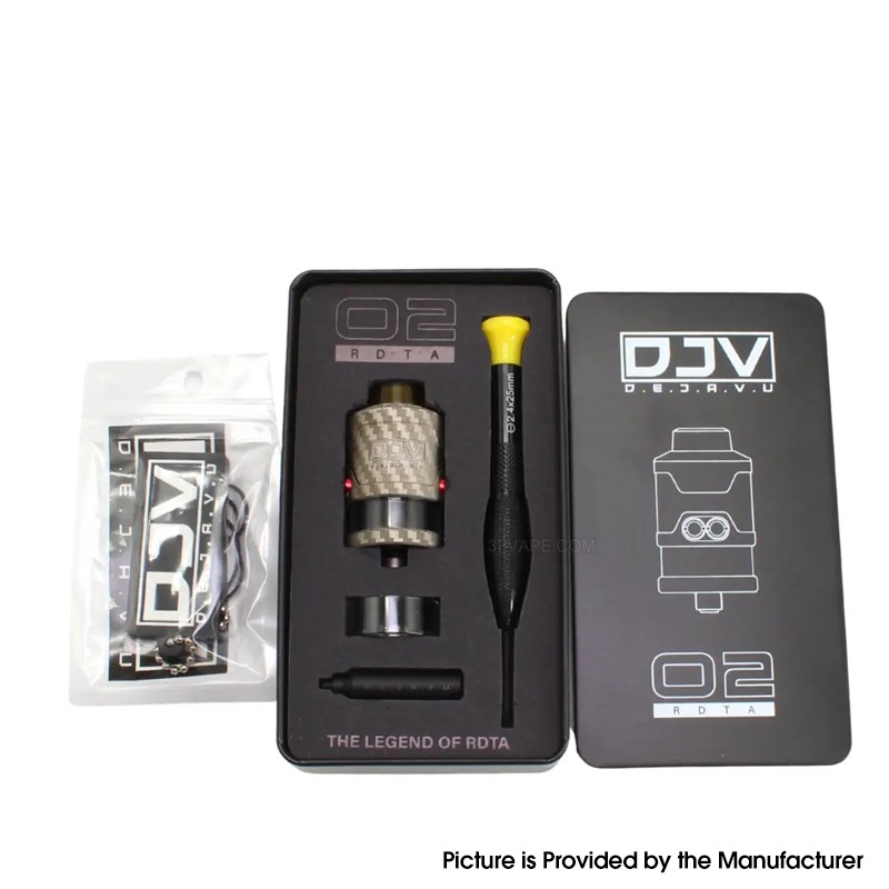 | Package | 1 x DEJAVU RDTA V2, 1 x Glass tube, 1 x Screwdriver (2.4 x 25mm), 1 x Adjustable airflow kit, 1 x Accessories (extra screws, tank rubber, keychain, sticker) |