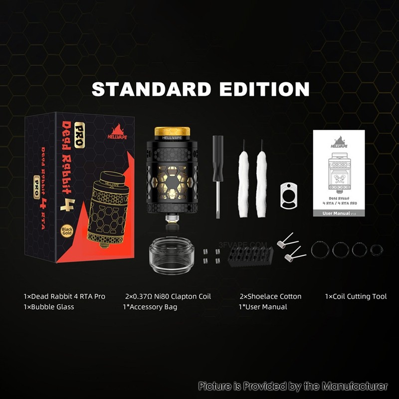 | Package | 1 x Dead Rabbit 4 RTA Pro, 1 x 5.5ml bubble glass tube (pre-installed), 1 x 3.5ml straight glass tube, 2 x Pre-built Coils, 2 x Shoelace Cotton, 1 x Accessory Pack (O-rings, screws), 1 x User Manual |