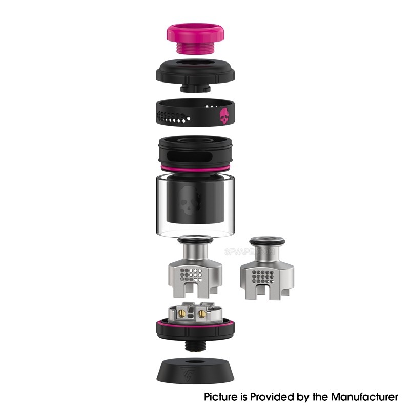 | Package | 1 x RTA, 1 x 510 Stand, 1 x 510 Drip tip Adaptor, 1 x 810 Derlin Dip tip, 1 x Single Coil Airflow Chamber, 1 x Bubble Glass, 1 x Coil Leg Trimmer, 2 x Fused Clapton Coils, 1 x Flathead Screwdriver, 1 x Allen Key, 1 x Spare Screws + Spare O-rings |