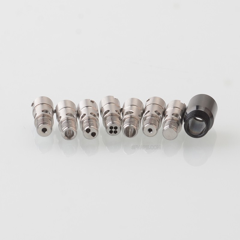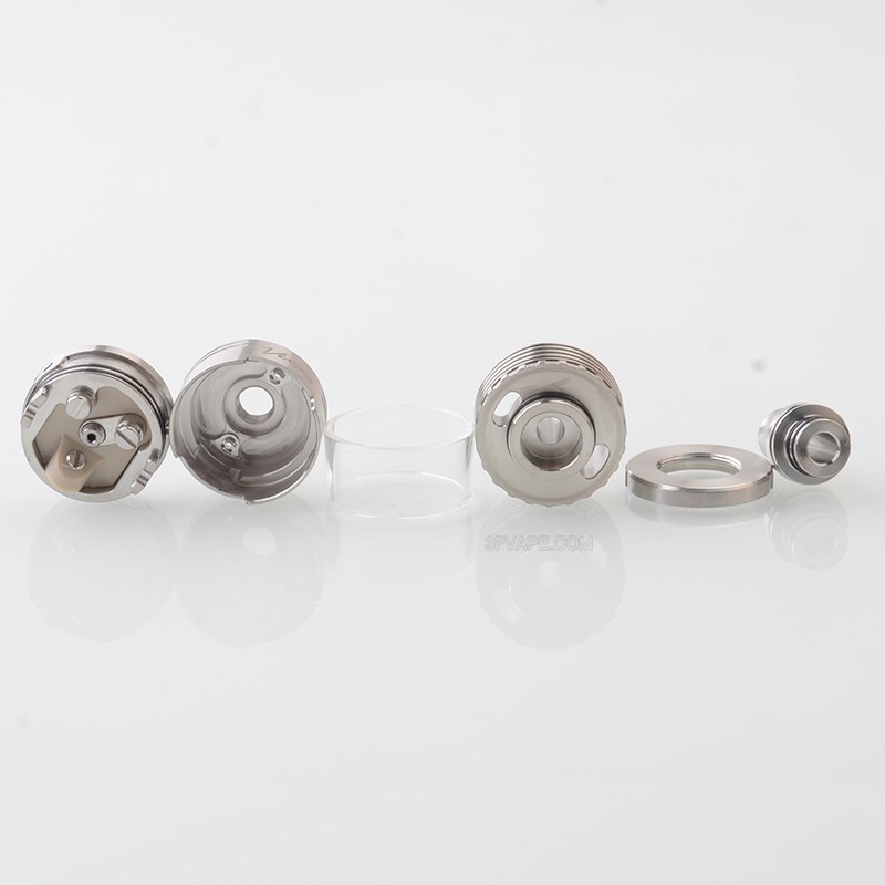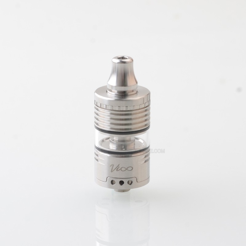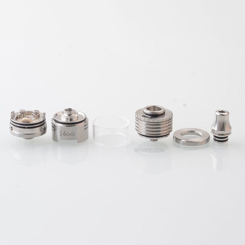 The Vico Style 22mm MTL / RDL RTA Rebuildable Tank Atomizer is made from Stainless Steel with 22mm diameter and glass tank tube with 4.0ml capacity. The RTA is with single coil deck, bottom airflow system and top refilling port. The RTA is with bottom air intake: 0.8mm, 1.0mm, 1.2mm, 2.0mm, 2.5mm, 2 x 1.0mm, 4 x 0.8mm, 0.0mm, one of each and 45 degree air intake: 0.8mm, 1.0mm, 1.2mm, 1.5mm, 1.8mm, 2.0mm, 0.0mm, one of each.