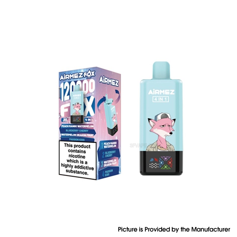 Authentic AiRMEZ Fox 4in1 120K Disposable Vape Kit 650mAh 60ml 5mg Strawberry Raspberry Strawberry Kiwi Strawberry Ice Peach Mango Watermelon Authentic AiRMEZ Fox 4in1 120K Disposable Vape Kit 650mAh 60ml 5mg Watermelon Ice Strawberry Watermelon Raspberry Watermelon Blueberry Raspberry Authentic AiRMEZ Fox 4in1 120K Disposable Vape Kit 650mAh 60ml 5mg Pink Lemonade Passion Kiss Mixed Berries Triple Berry Authentic AiRMEZ Fox 4in1 120K Disposable Vape Kit 650mAh 60ml 5mg Cherry Love 66 Berry Lemonade Grape Ice Authentic AiRMEZ Fox 4in1 120K Disposable Vape Kit 650mAh 60ml 5mg Mango Peach Tropical Fruit Peach Ice Sour Mango Pineapple Authentic AiRMEZ Fox 4in1 120K Disposable Vape Kit 650mAh 60ml 5mg Grape Ice Love 66 Blueberry On Ice Dragonfruit Ice Authentic AiRMEZ Fox 4in1 120K Disposable Vape Kit 650mAh 60ml 5mg Love 66 Cherry Blueberry On Ice Kiwi Passion Fruit Guawa Authentic AiRMEZ Fox 4in1 120K Disposable Vape Kit 650mAh 60ml 5mg Peach Ice Pink Lemonade Watermelon Ice Dr Blue Authentic AiRMEZ Fox 4in1 120K Disposable Vape Kit 650mAh 60ml 5mg Red Mojito Love 66 Mixed Berries Strawberry Watermelon Authentic AiRMEZ Fox 4in1 120K Disposable Vape Kit 650mAh 60ml 5mg Peach Mango Watermelon Blueberry Cherry Watermelon Dragon Fruit Passion Kiss