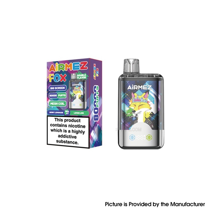 The authentic AiRMEZ FOX 2 IN 1 80K, offering up to an astounding 80,000 puffs. Thanks to its 2-in-1 double flavor design, users can easily switch between two distinct 15ml e-juice chambers - doubling both variety and enjoyment in one sleek device.