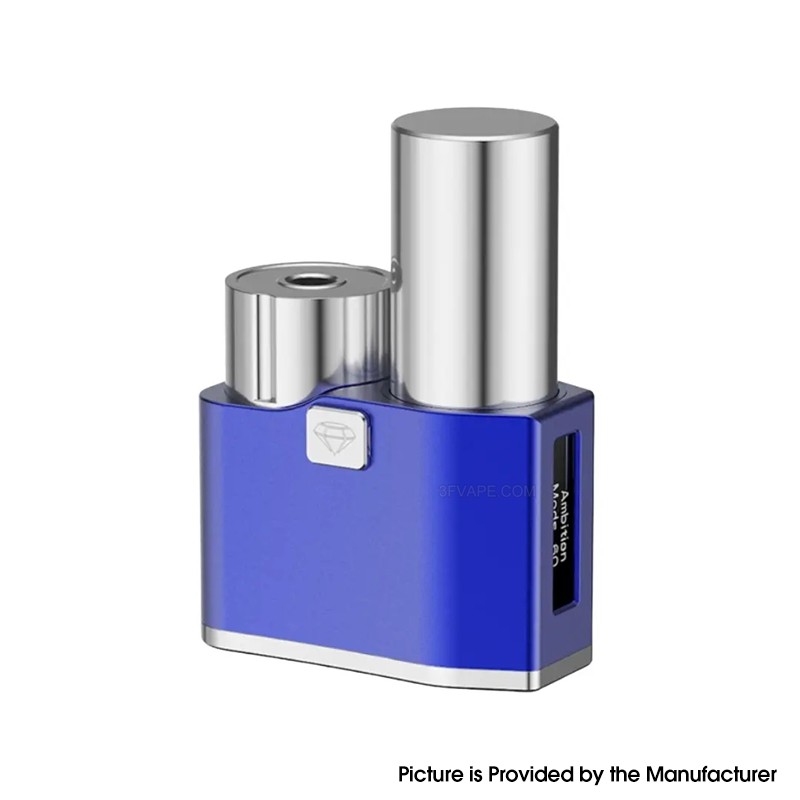 The authentic Ambition Mods Emira SBS Box Mod: Compact side-by-side design, adjustable 510 pin, 60W max power output, OLED display, and compatible with tanks up to 23mm.