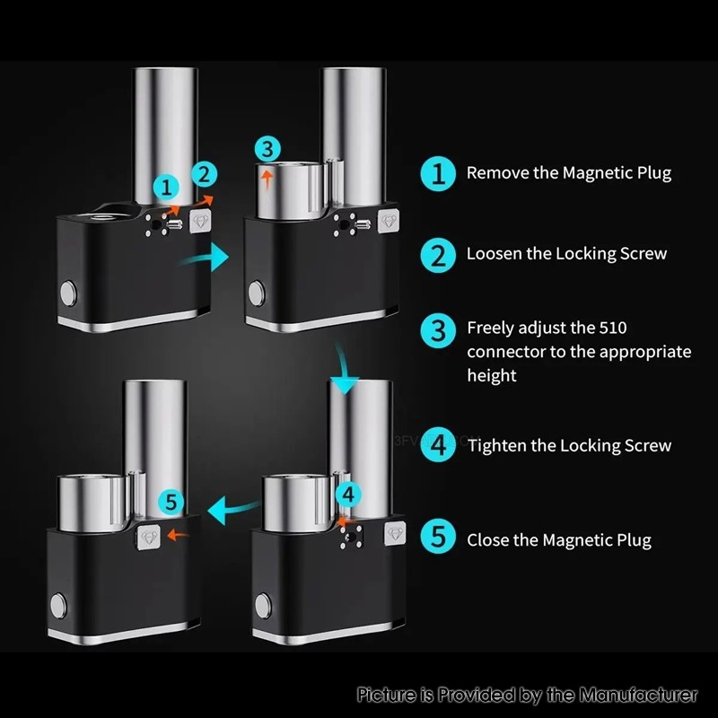 The defining feature of the Emira is its adjustable 510 connector. By removing the front magnetic plug and loosening the screw, you can change the 510 height to match your chosen tank. This keeps the setup looking clean and aligned, even with different tank sizes.