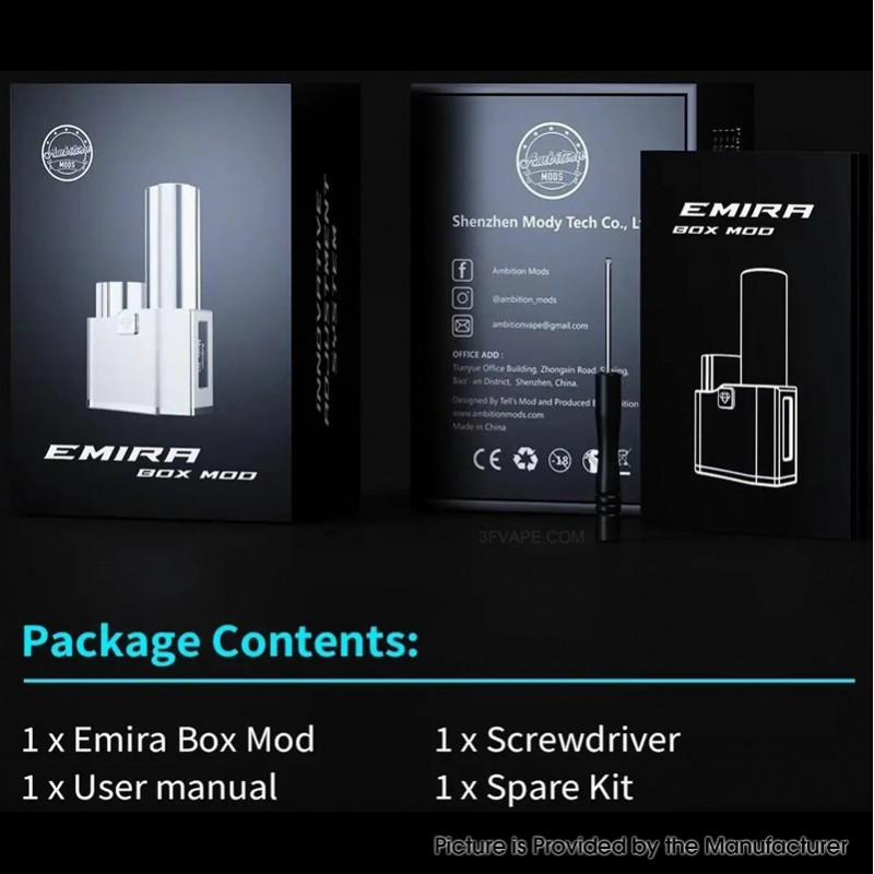 | Package | 1 x Emira SBS Box Mod, 1 x Screwdriver, 1 x Bag of Spares, 1 x User manual |