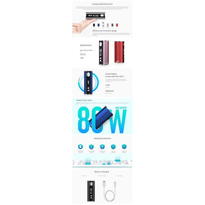 The Eleaf iStick T80 Mod is compact mod, stylish and simple appearance, small size and easy to carry in every occasion. The Eleaf iStick T80 Mod features a large 3000mAh built-in battery which is available for your Eleaf iStick T80 kit(with Pesso / with MELO 4 D25). There are several VW Modes to adjust to meet different demands (Ni, Ti, SS, TCR-M1 / M2 / M3 Mode). And charging via the Type-C port for a stable and long-lasting experience. The Eleaf iStick T80 Mod has a 2A charging current, and plugging into the USB Type-c port results in a larger charging current, which means less charging time. In addition, the Eleaf iStick T80 can transmit up to 80W of power and various working modes while supporting short circuit protection and low voltage protection to provide you with safe.